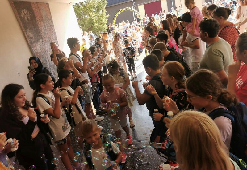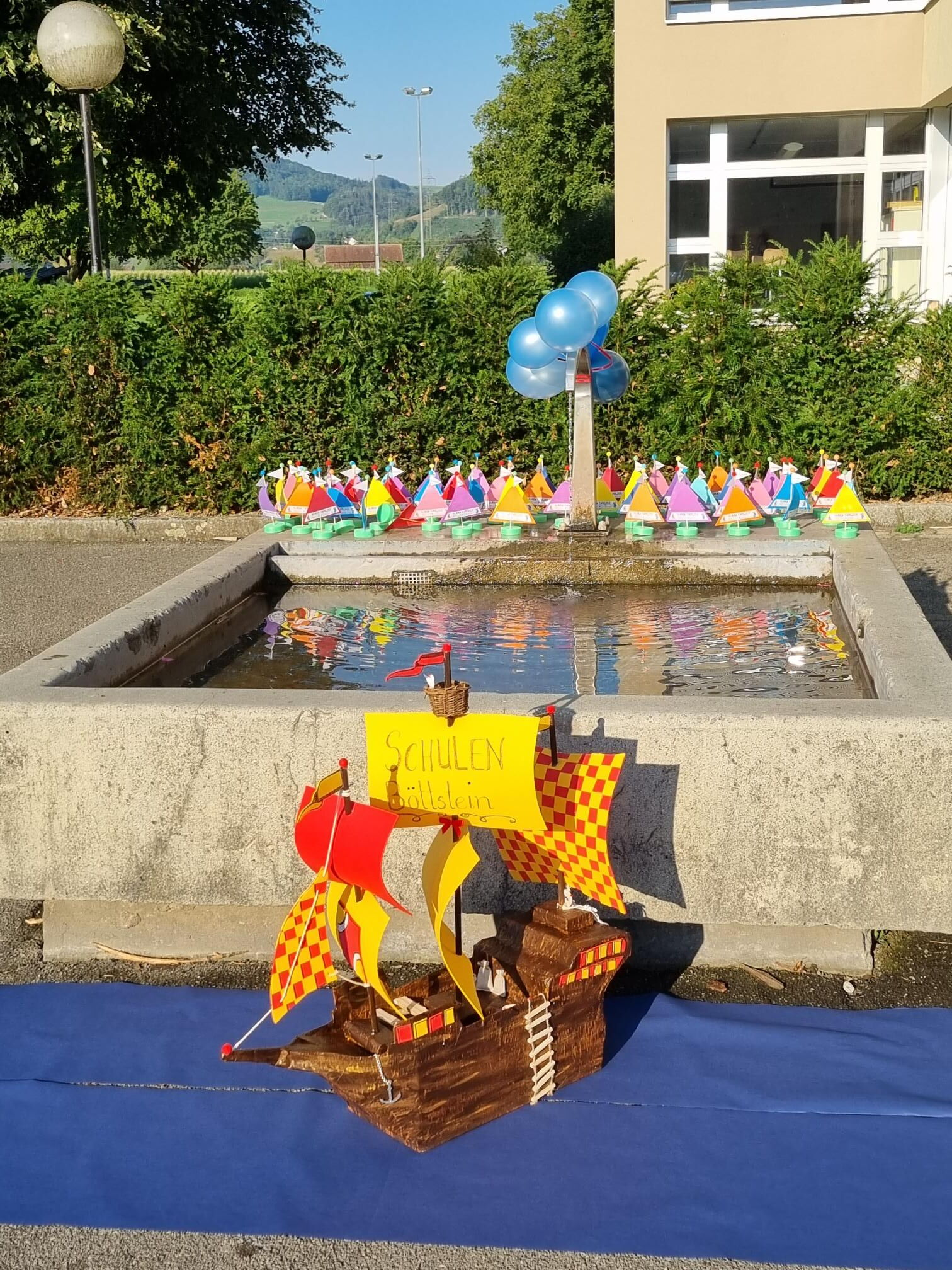 Die nervösen Erstklässler lauschten aufmerksam der Begrüssungsrede von Frau Lüscher, unserer Schulleiterin. Eine Lehrerin stellte ein Schiff in den Brunnen, da unser Schuljahresmotto «Leinen los!» heisst. Als sie fertig war, sangen alle ein Lied und wir Sechstklässler übergaben ihnen ein Leselineal mit zwei Farbstiften und ein kleines Schiffchen. Wir Sechstklässler, die nun Gotte und Götti der Erstklässler sind, stellten uns in zwei Reihen auf und bliesen Seifenblasen in die Luft, sodass sie darunter ins Schulgebäude laufen konnten. Dazu sangen alle noch ein Lied, das wir Kinder vorher auswendig gelernt hatten.