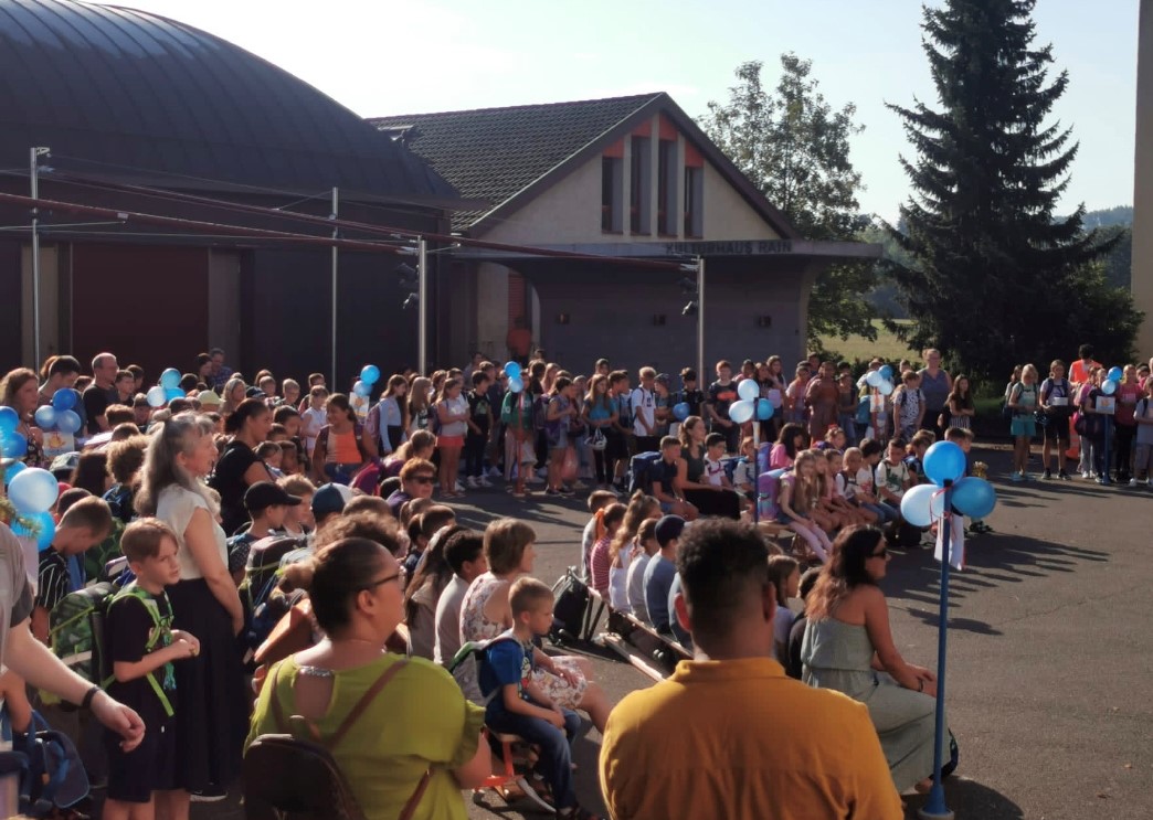 Wir trafen uns, um die neuen, aufgeregten Erstklässler zu begrüssen, damit sie sich willkommen fühlen an unserer Schule. Bei Sonnenschein und blauem Himmel war es sehr warm auf dem Pausenplatz. Um 09.15 Uhr ging die Begrüssung los.