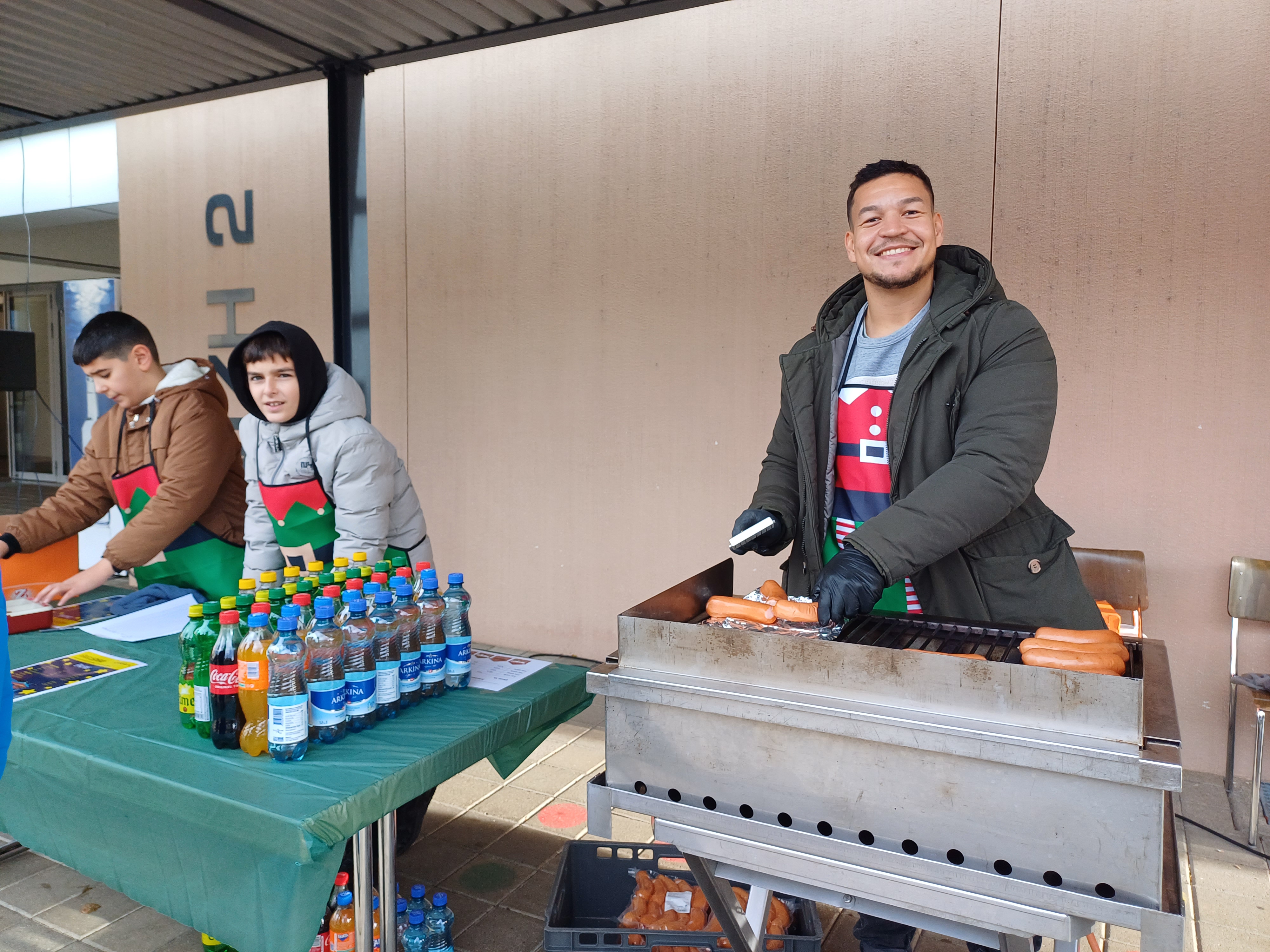 Schülerinnen und Schüler der 3. bis 6. Klassen sowie der Oberstufe boten selbst gebastelte Geschenke und verschiedene Leckereien zum Verkauf an. Das Angebot reichte von Schmuck, Kerzen, Tees und Kräutern über Honig, Marmelade und Weihnachtsdekorationen bis hin zu Kuchen, Keksen und gebrannten Mandeln. Die Fünftklässler der Klassen 5a und 5b betreuten den Grillstand neben der Turnhalle 2 und verkauften heiße Würste, kalte Getränke sowie Pommes-Chips. Alle Helferinnen und Helfer trugen dabei lustige Weihnachtsschürzen. Die Marktstände waren festlich mit Lichtergirlanden, Sternen und Kränzen geschmückt, was zur stimmungsvollen Atmosphäre beitrug.
