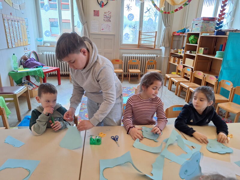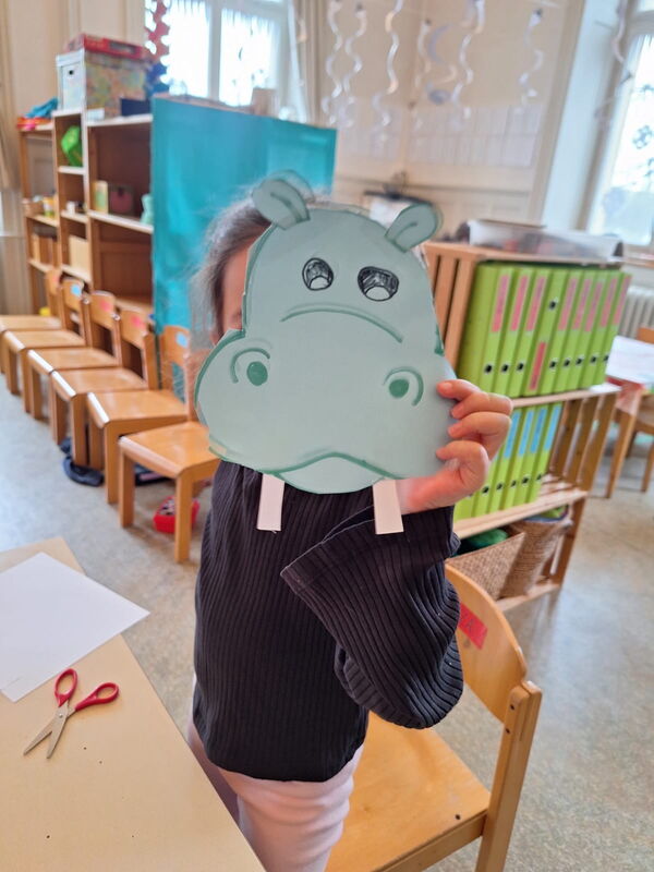 Zum Abschluss setzten sich alle kreativ mit dem Thema auseinander und gestalteten gemeinsam Nilpferdmasken. Mit Geduld, Geschick und Fantasie entstanden originelle Werke. Die Viertklässler übernahmen fürsorgliche Unterstützungsrollen beim Schneiden und Kleben, liessen den Kindergartenkindern gleichzeitig genügend Freiraum, um eigene Entscheidungen zu treffen.