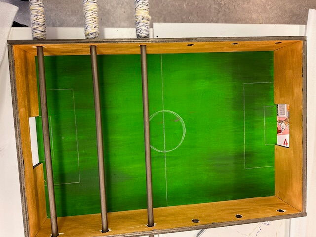Jedes Bauteil entsteht in Teamarbeit: Vom stabilen Holzrahmen über die weissen Spielstangen bis hin zum blau bemalten Spielfeld mit fein gezogenen Linien — alles wurde von den Schülerinnen und Schülern gefertigt, bemalt und montiert. Besonders eindrücklich ist das Zusammenspiel: Während ein Kind an der Maschine arbeitet, beobachten und unterstützen die anderen, tauschen Ideen aus und planen die nächsten Schritte. So verschmelzen technisches Verständnis, handwerkliches Geschick und kreative Gestaltung zu einem echten, gebrauchsfertigen Produkt.