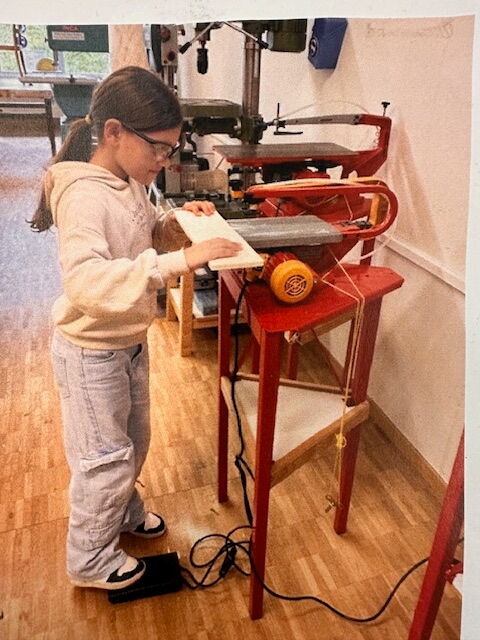 Unter fachkundiger Anleitung lernen sie den sicheren Umgang mit Werkzeugen und Maschinen wie der Standbohrmaschine und der Decoupiersäge.