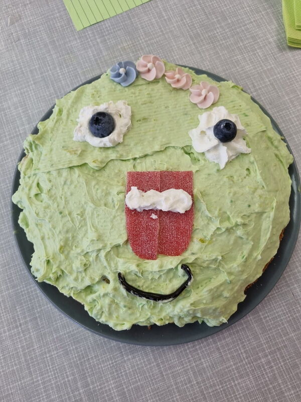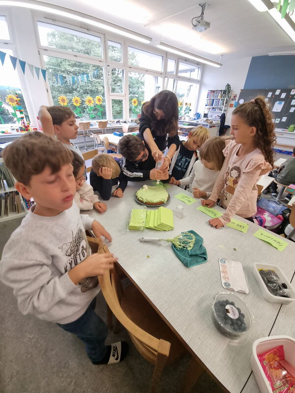 Für die Beantwortung der zweiten Frage muss etwas mehr ausgeholt werden. Die Erstklässler arbeiten viel mit dem «kleinen Wir», einem haarigen, grünen Wesen das für die Freundschaft und den Teamgeist steht. Die Schulsozialarbeit hat das zum Anlass genommen um mit den Schülern zu thematisieren, welche «Zutaten» eine richtige Freundschaft hat. Die Zutaten zum Kuchen wurden dann mit den Zutaten zur Freundschaft benannt. Und so entstand ein leckerer, grüner Kuchen auf einem «Team-Biskuitboden» und unter Einsatz von viel «gemeinsame Hobbies Rahm» und mit «Aufmerksamkeitsgrüner Lebensmittelfarbe». Zum Gesicht vom «kleinen Wir» verziert wurde der fertige Kuchen dann mit «Teilen-Heidelbeeren», «Geschenk-sauren Zungen» und «Zusammen spielen Lakritz». Der Benennung der Zutaten sind dabei keine Grenzen gesetzt. Das Rezept für den Freundschaftskuchen finden Sie direkt weiter unten zum Download.