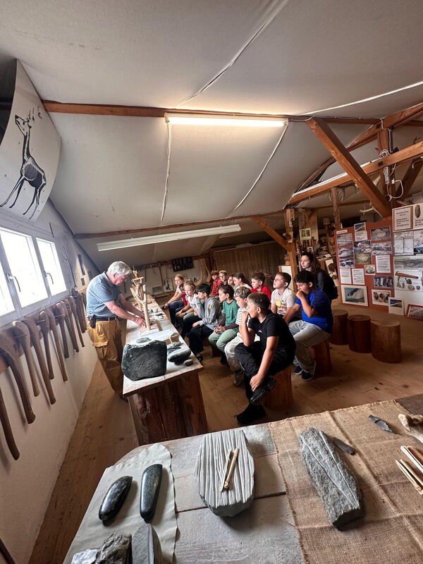 In der Werkstatt durften wir zahlreiche Steine aus der Steinzeit bestaunen und erfuhren viel Spannendes über das Leben der Menschen in dieser Epoche. Besonders beeindruckend war, dass der Leiter der Werkstatt, Herr Zurbuchen, selbst Archäologe ist und sogar bei der berühmten Ausgrabung des „Ötzi“ mitgearbeitet hat. Zum Abschluss der Führung zeigte er uns, wie die Menschen in der Steinzeit Feuer machten. Mit Feuersteinen schlug er Funken und entfachte vor unseren Augen ein kleines Feuer – ganz ohne moderne Hilfsmittel.