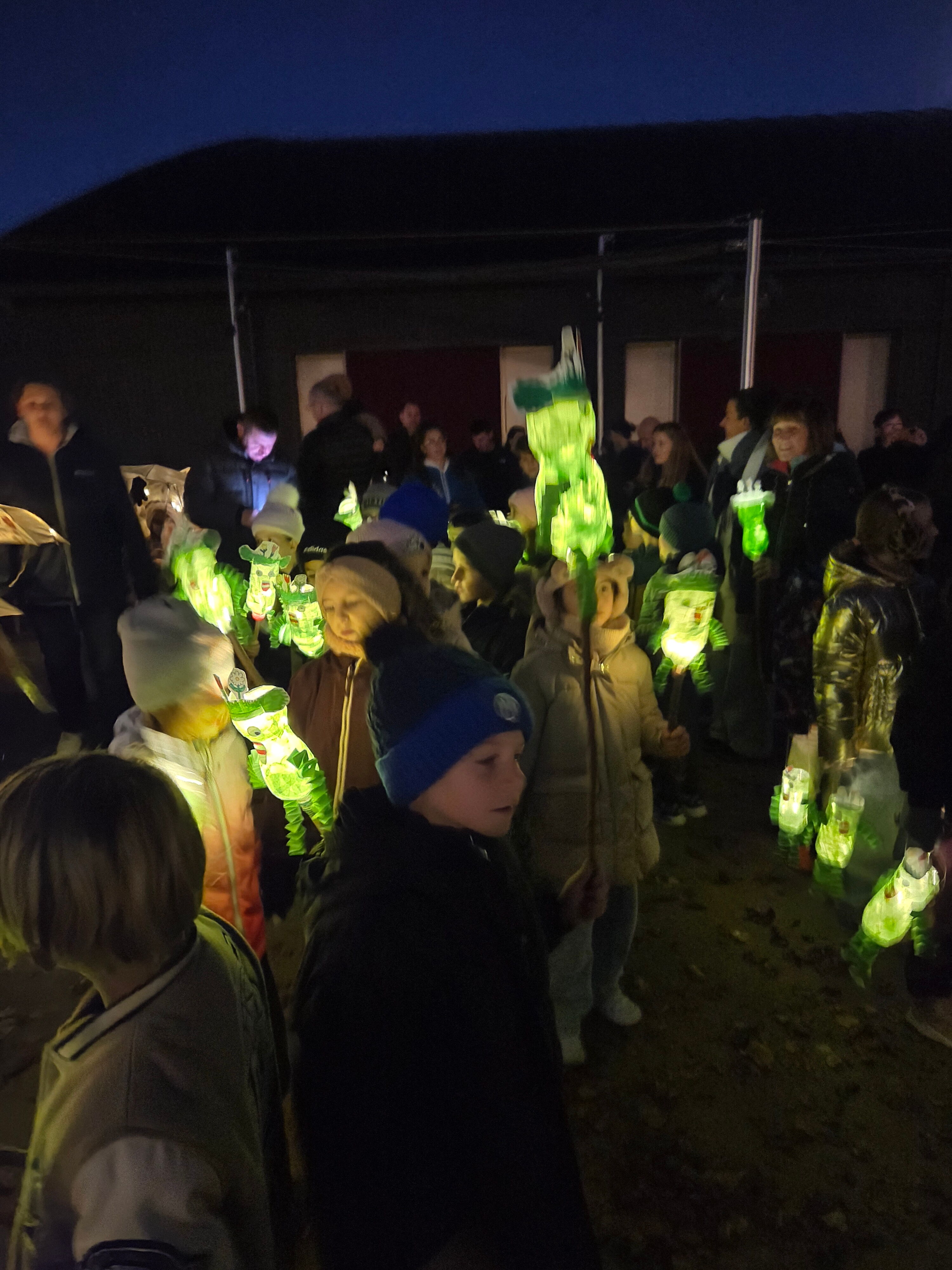 Der Umzug wurde von den Tambouren aus Brugg-Windisch angeführt. Mit ihren leuchtenden Drumsticks sorgten sie für einen besonderen Blickfang und führten unsere Schülerinnen und Schüler, sicher durch die dunkle Nacht. Die Kinder zeigten stolz ihre bunt gestalteten Räbeliechtli, Laternen und liebevoll geschmückten Wagen. Unser neuer Schulbrunnen wurde dekoriert und stimmungsvoll in Szene gesetzt. Die hell leuchtenden Laternen und Räben erhellten die klare Herbstnacht auf wunderbare Weise. Die Kinder waren so begeistert von diesem magischen Moment, dass sie beim Zurückkehren zum Schulhausplatz voller Freude fragten: „Warum ist der Umzug schon vorbei?“ – ein wunderbares Zeichen dafür, wie sehr sie den Abend genossen haben.