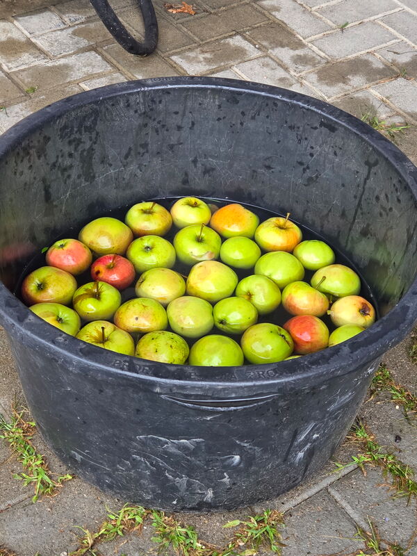Danach begannen die Gruppen mit dem Einsammeln der Früchte. Trotz des Regens waren alle fleissig am Arbeiten und sortierten das Fallobst, bevor es dann gewaschen und in der Maschine geraffelt wurde.